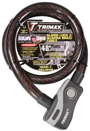 Integrated Alarm Cable Lock. Push button activation and weather resistant housing. Alarm will also reset itself